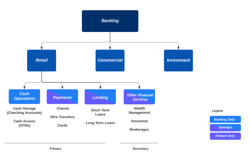 Here, it helps to visualize a bank. Most consumers think of money withdrawals when we think of a bank. But when you look closer, there are different categories of banking services – retail (caters to consumers), commercial (for merchants), investment banks (for M&As etc). Within each category, there are also subcategories. For example, consumer banks cover services across deposits, payments, lending etc.