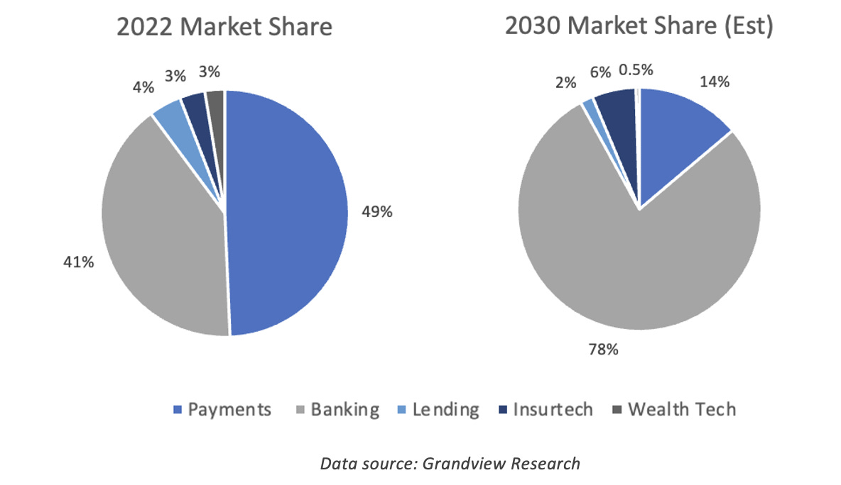 Looking at the data, we do see payments, banking and lending leading the existing market size. I am slightly surprised by the small size of the digital lending market! I imagine that either lending is a small share of the economy, or that commercial loans are slow to digitize.